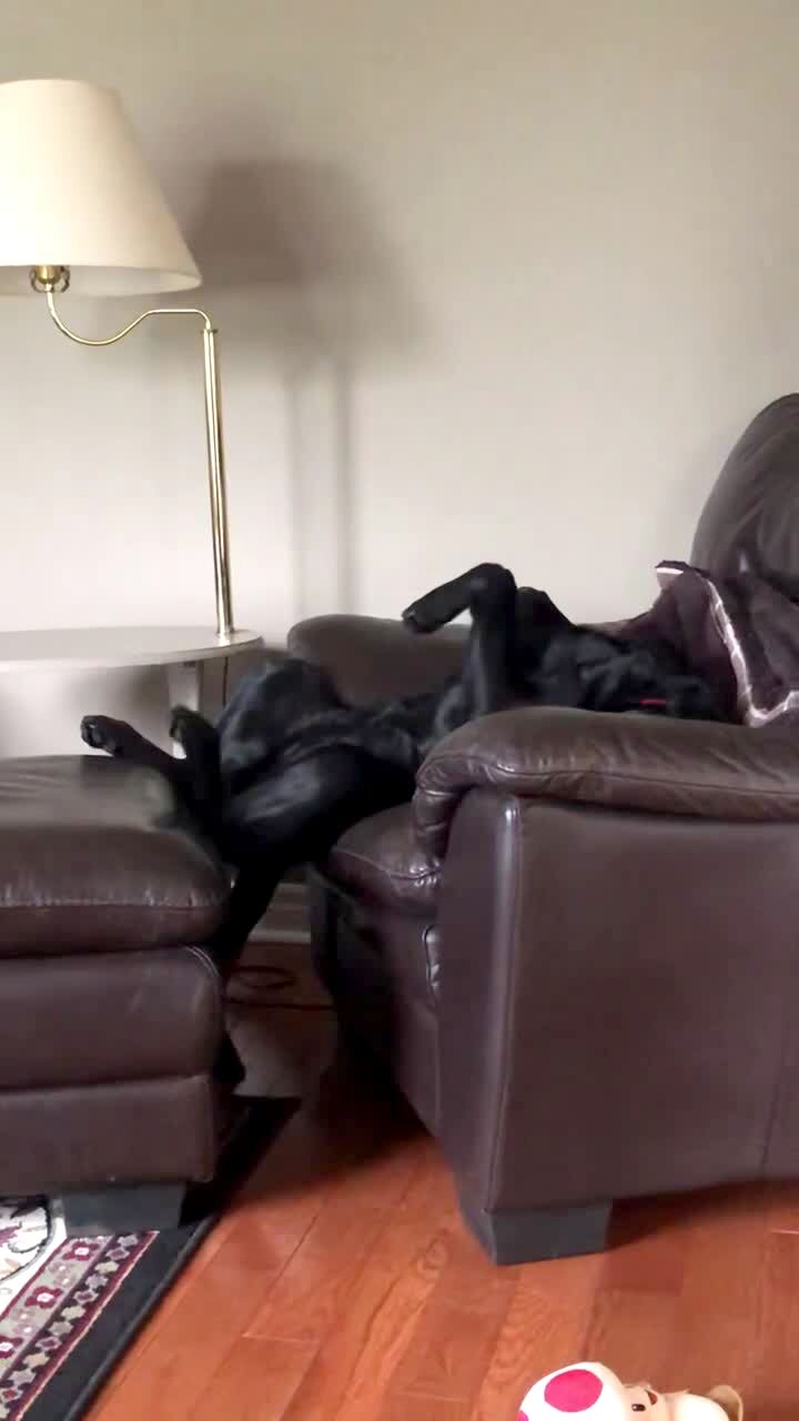 A dog lies on its back in a recliner with its hind legs on an ottoman and falls onto the floor in the living-room.