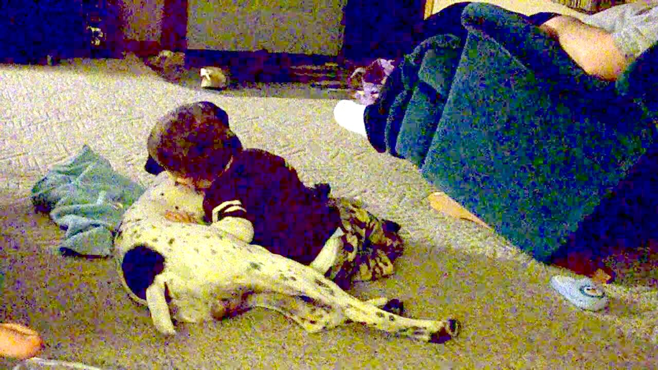 Tot boy kisses large dog on floor in house. Dog pushes him over with its paw