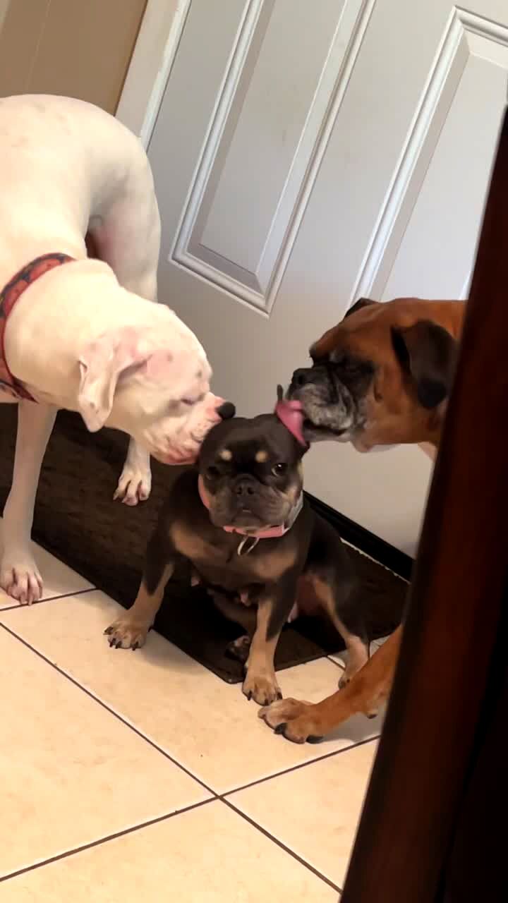 A man and woman lean into each other for a kiss when their dog comes between them and aggressively licks their faces indoors.