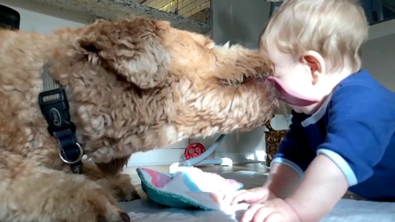 A Labradoodle dog licks a baby in slow motion in the living room.