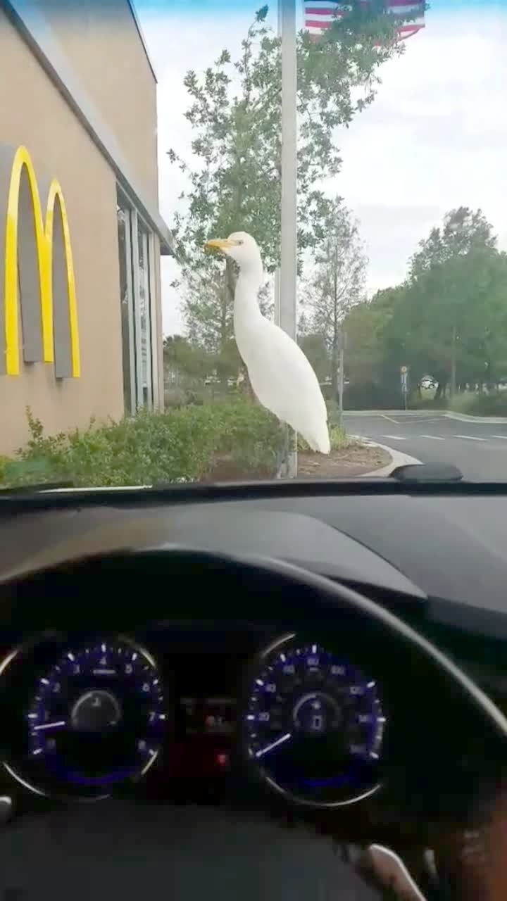 While a bird sits in a bird-feeder on a patio deck, a cat leaps in and hits the door, as the bird flies away.