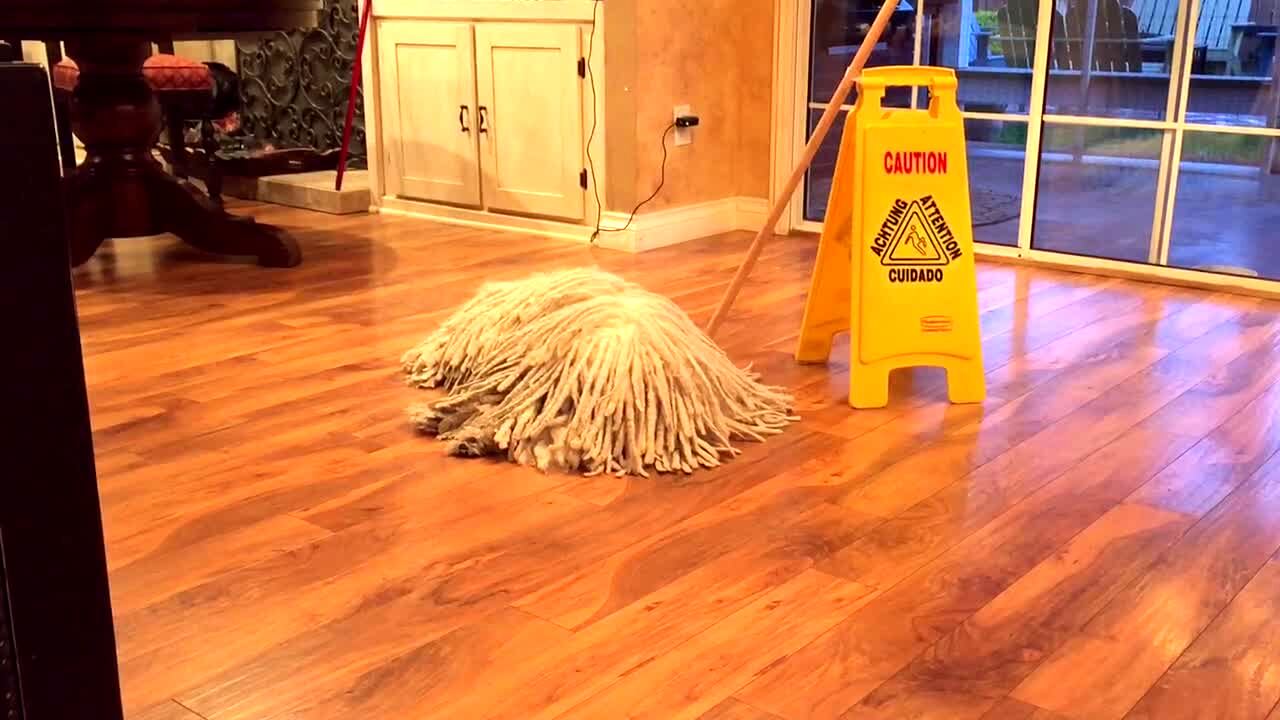 A dog that looks like a mop sits beside a "Caution Wet Floor" sign before a knock is heard at the door and the dog gets up and walks away.