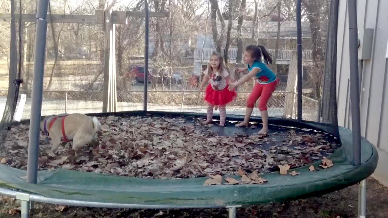 Two girls stand on one side of a trampoline and complain that there's poop on the trampoline before their pug dog poops repeatedly in various places on the trampoline and they point and scream from their side "He's pooping!" repeatedly.