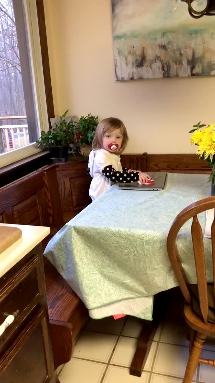 A woman catches her tot daughter who pretends to type on a laptop on the kitchen table but as soon as her mom asks "what are you doing" the girl slams the laptop shut and stands up on the chair and says, "nothing."