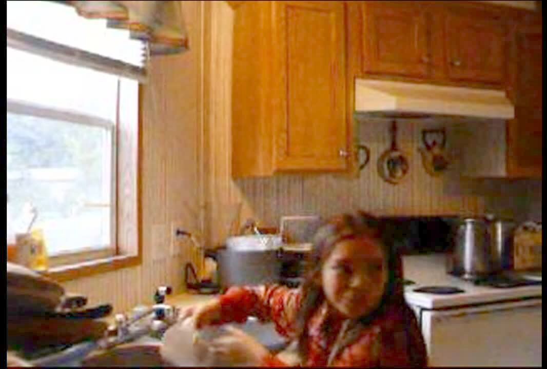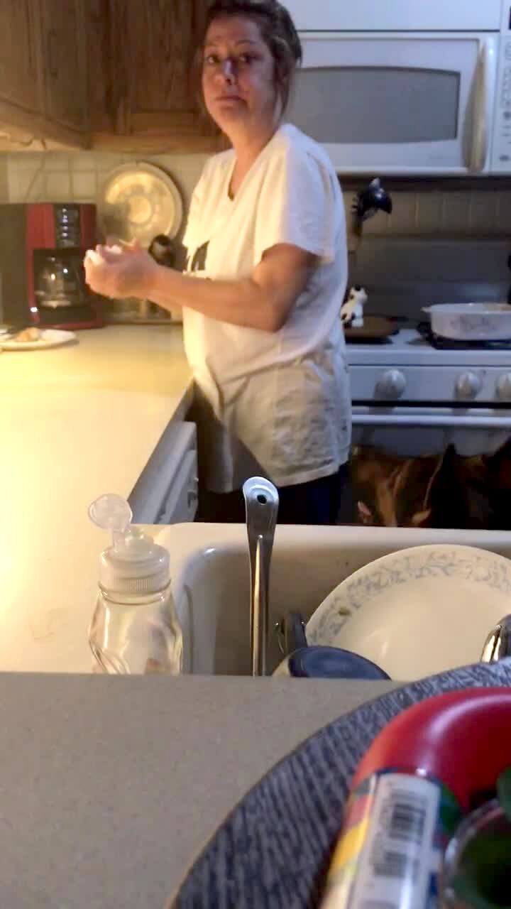 A woman gets sprayed in the face by the taped hose sink trick in a kitchen. Her husband and another 2 women laugh and then realize what the prank was.