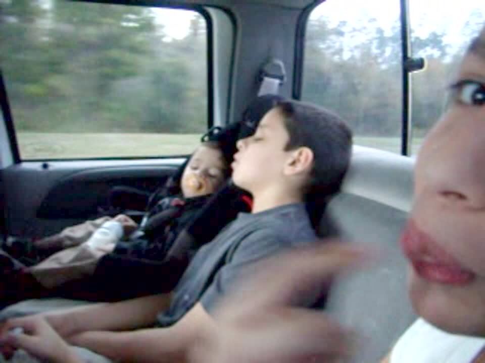 In the back seat of a car, a girl gives a sleeping boy a wet willy. He wakes up and says 'Eww.'