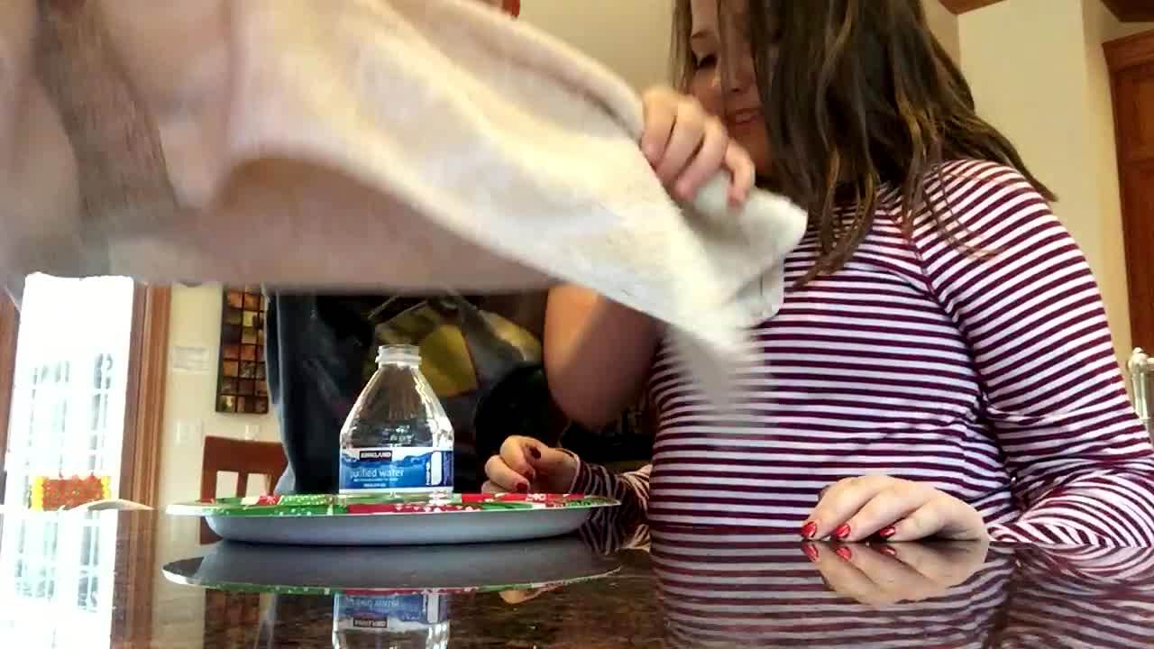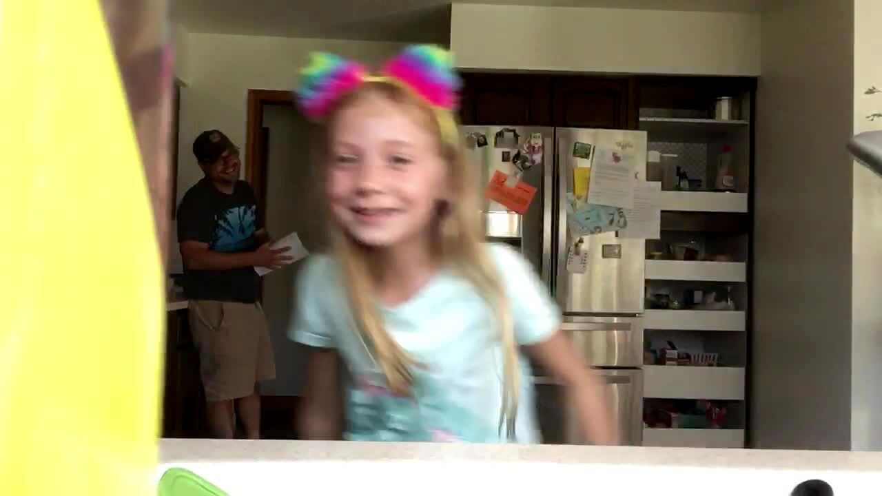 A young girl cuts into a frosted water balloon in the kitchen on her birthday, then yells "Mom" while a woman laughs.