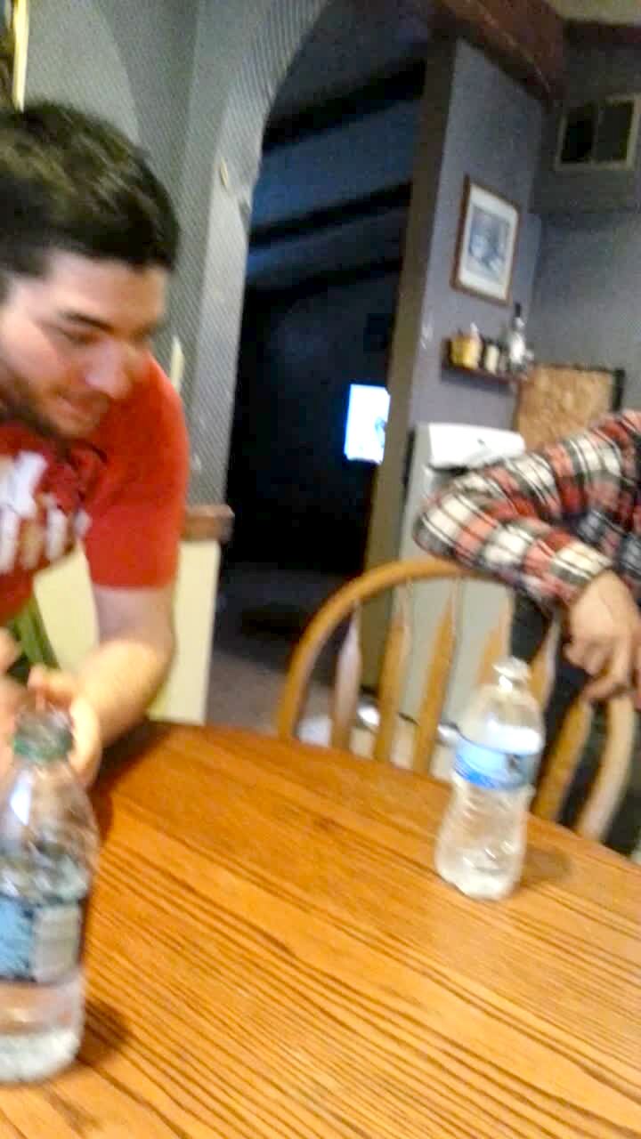 A boy does the water bottle coin prank on his sister in the kitchen, but she won't fall for it. He leans in to show her how to look into it, but she squeezes the bottle and sprays him instead.