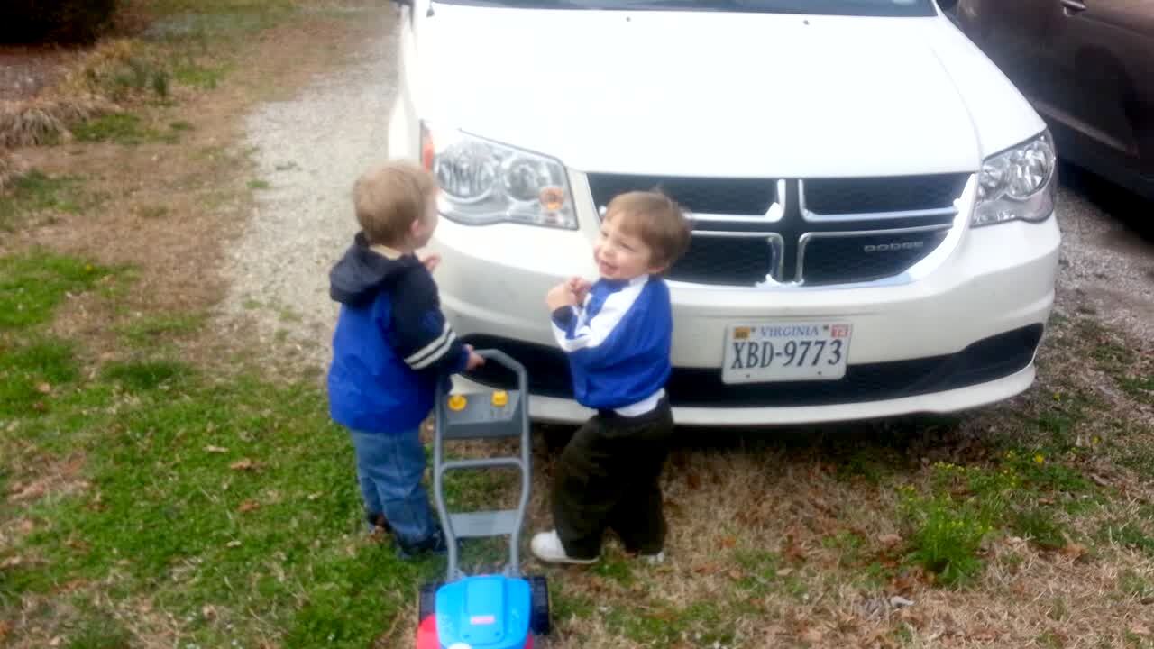 Twin tot boys touch a car outdoors and each time they touch it, the horn honks and they scream and shake excitedly. At 1:30:00 there is a louder horn and they each think something is wrong before they resume touching the headlight and squealing from the honk.