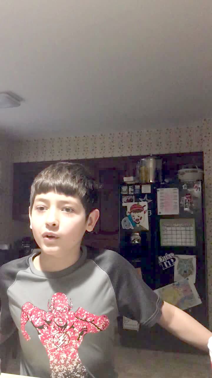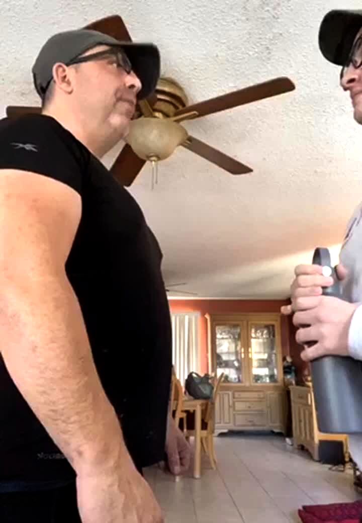 A teen boy asks his dad what noises different animals make in a living room. He asks him what a whale says, then takes a sip of water and spits it in his dad's face.