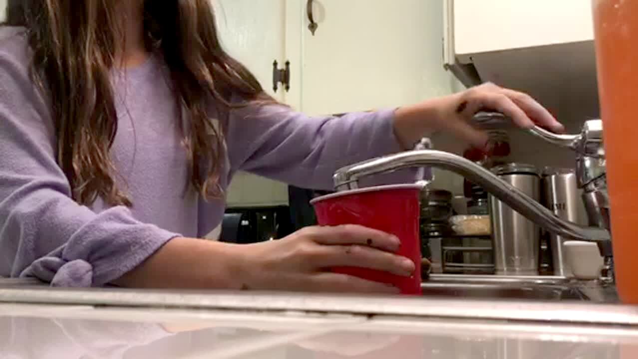 A young girl turns on the kitchen sink and it sprays out right at her then her brother laughs.