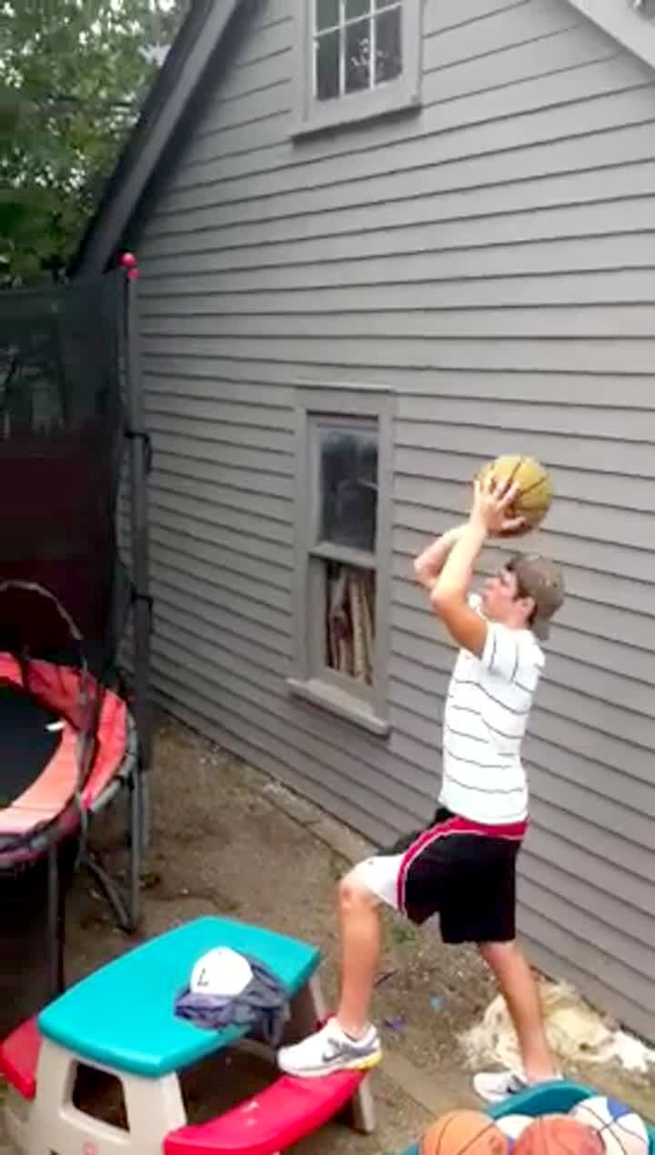 A teen boy stands on a porch railing outdoors and tosses a basketball onto the room. The basketball rolls down, bounces on the ground, and scores into a basketball hoop.