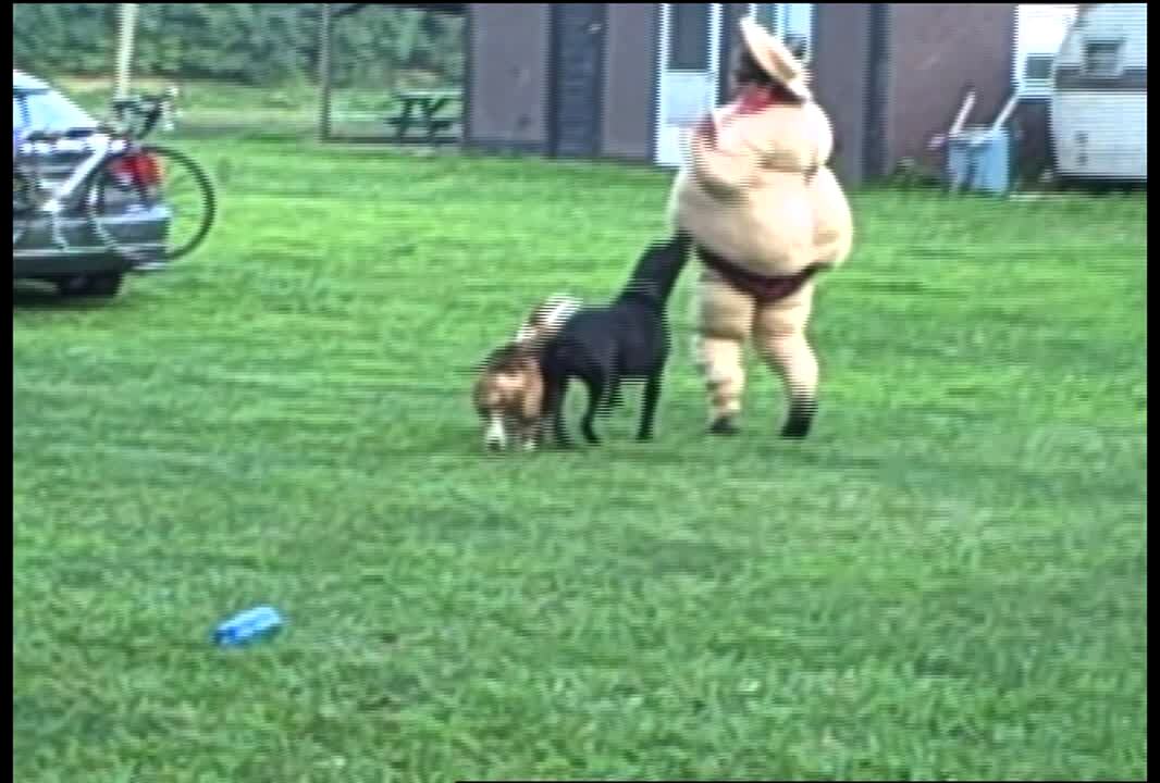 Teen boy sleeps in a chair in the yard. Man drives up in a tractor with a bucket of water on the end. Tractor guy tips the bucket up and pours the water on the sleeping teen. He gets up and chases the tractor, slips on the grass a few times. Practical joke/prank.