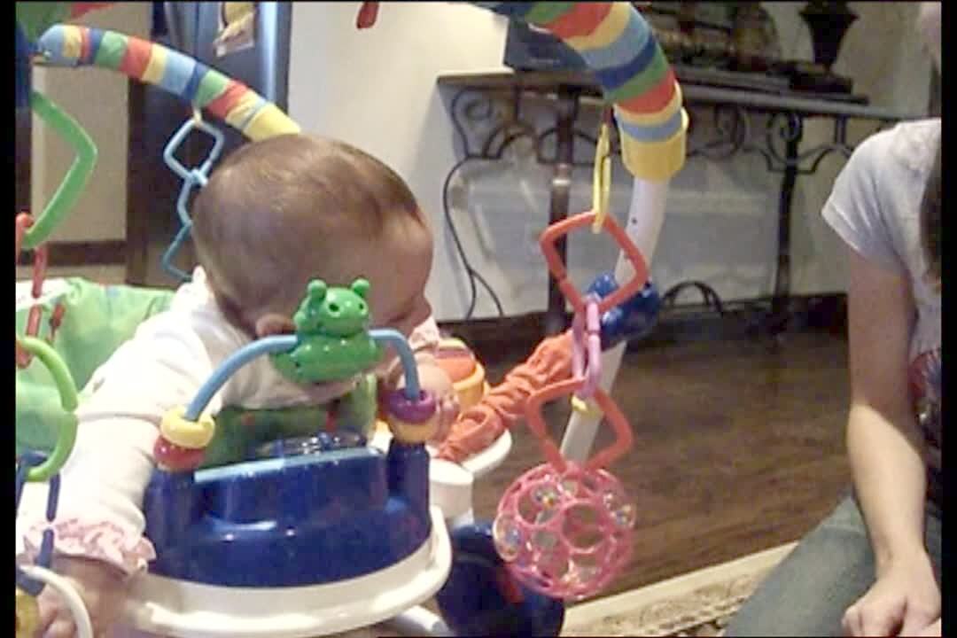 Baby girl sitting in a walker laughs at operatic musical greeting card. Cute.
