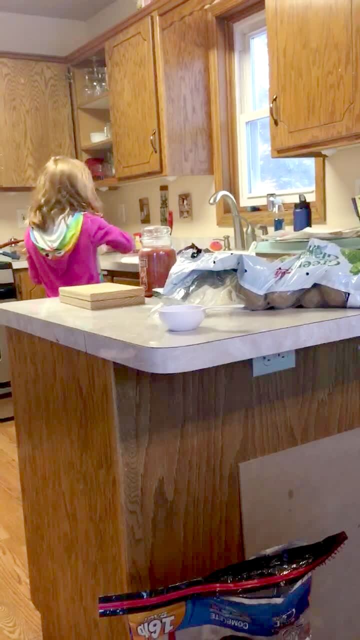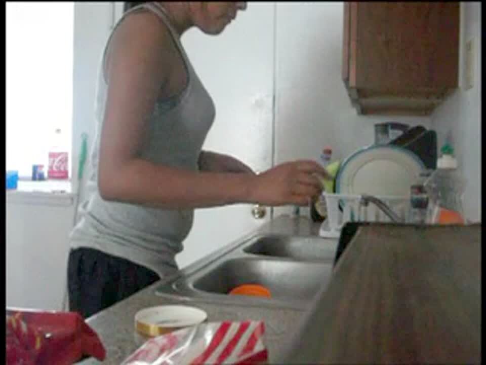 Teen girl sets the kitchen sink to spray her mom by taping the hose together, so mom turns the faucet on & gets sprayed. Practical joke.