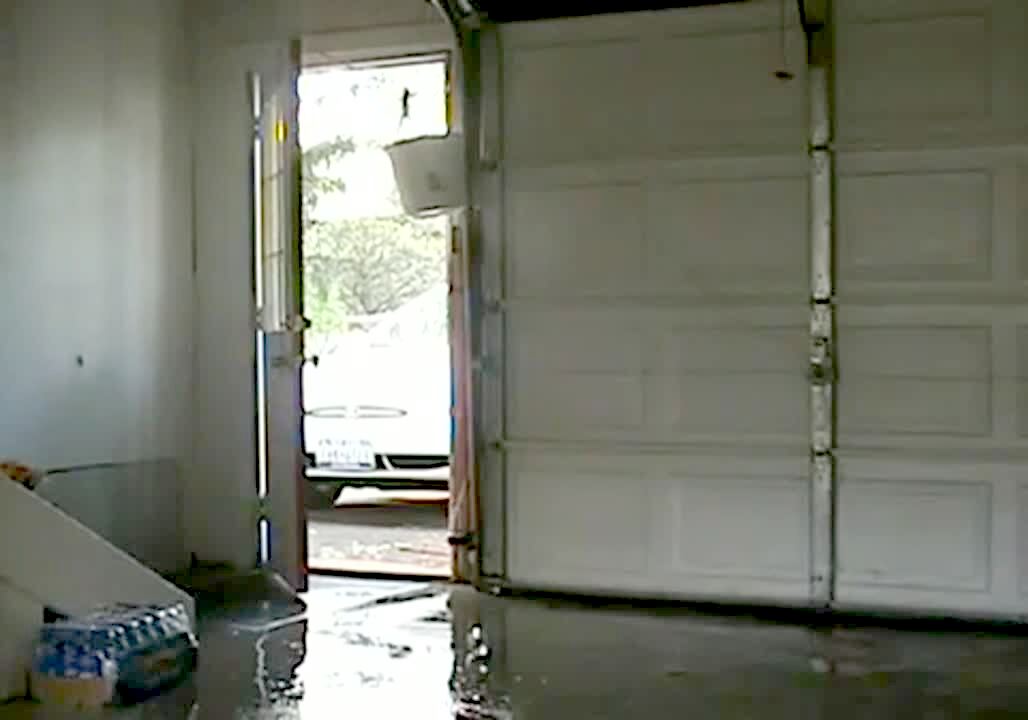 Teen girl walks into a garage from outside and a bucket of water from above the door falls down, splashes and soaks her. Practical joke, prank.