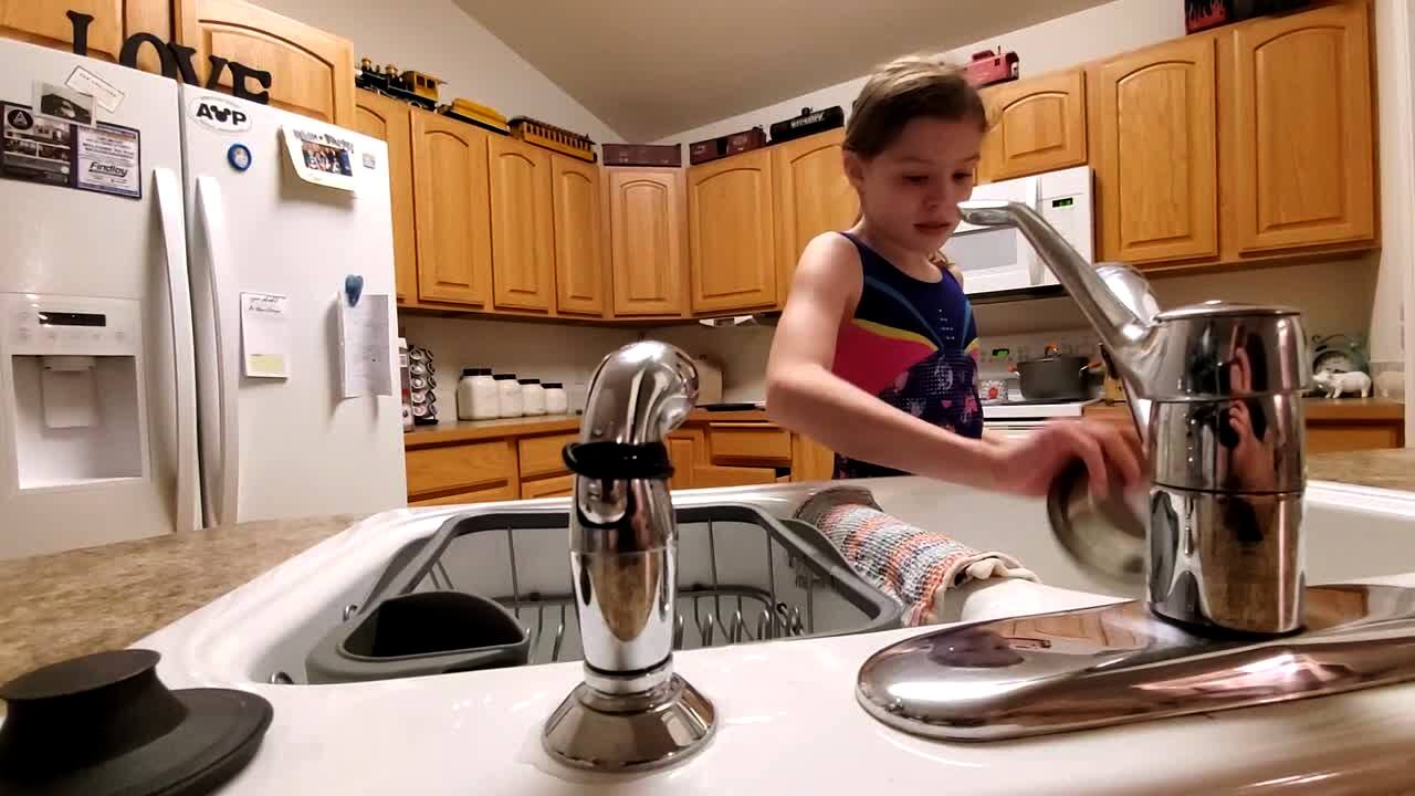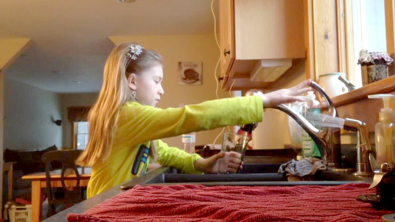 A young girl tries to get a glass of water but gets sprayed in the face. Practical joke.