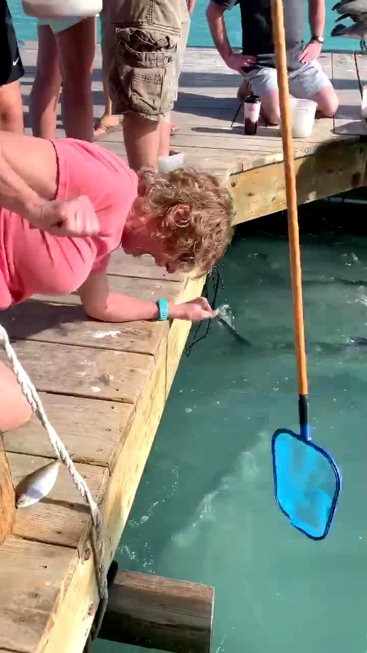 A woman tosses a treat to her small dog in slow motion and her larger dog jumps in front of it and steals the treat.
