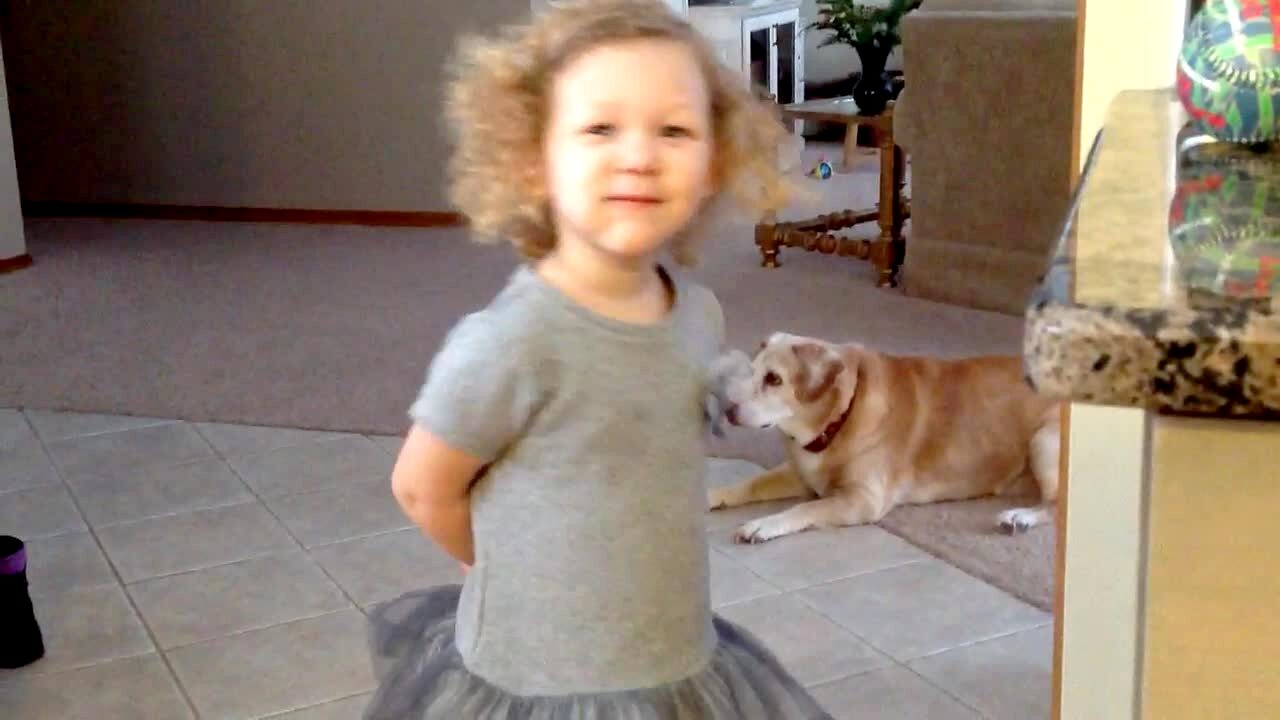 A tot girl admits to stealing a cookie, holds it behind her back, and moves away from her mom when her mom says she's not supposed to have it. A dog behind her eats it out of her hand and the girl throws a tantrum and cries.