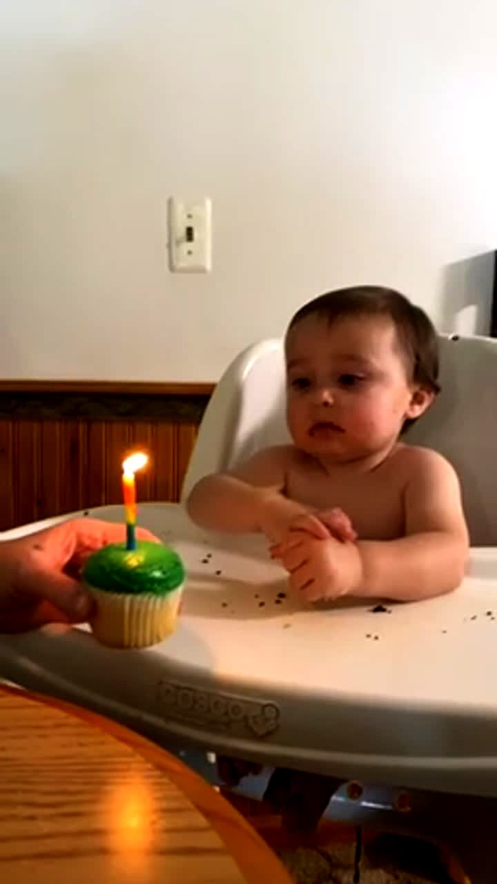 The camera woman, a man, and a young boy sing 'Happy Birthday' to a mixed breed dog in the dining room. They tell the dog to blow the candle on its small birthday cake. The dog eats the cake and the candle in one bite while the candle was still lit. Action 1 minute to end. Very dark.