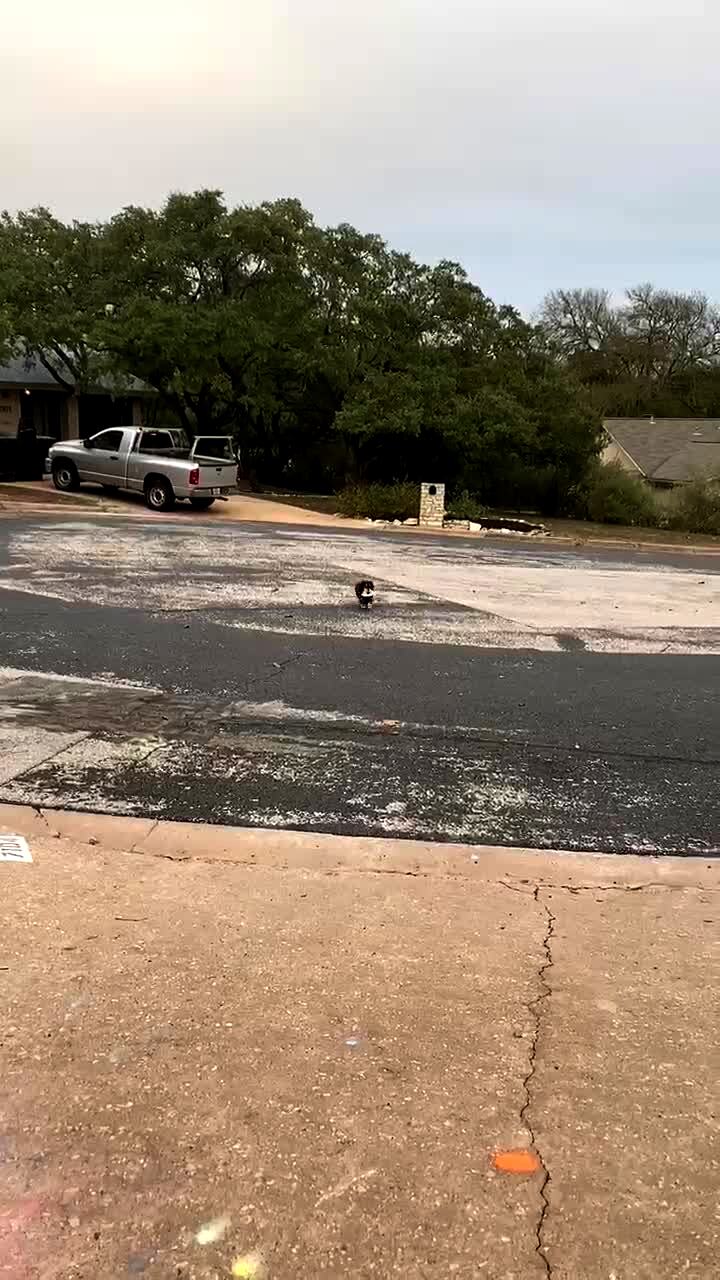 A dachshund dog walks across a street towards the man with the camera and the dog carries a stolen quesadilla in its mouth.