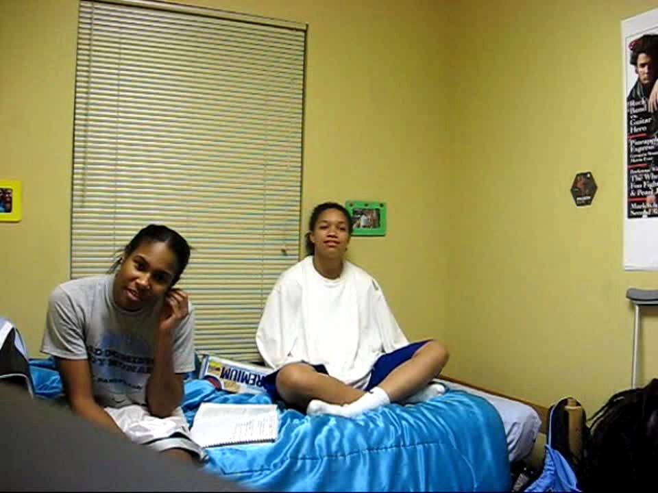 One teen girl in the house lies on the bed with her feet up as her friend tries to balance on her legs. She falls off and breaks a window.