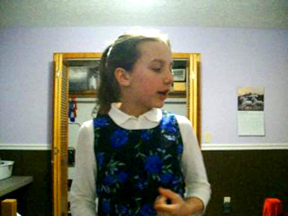 A teen girl makes a Happy New Year presentation in a bedroom as another girl hides in a closet behind her. The first girl yells, swings a tennis racquet, and smashes a light above her head.