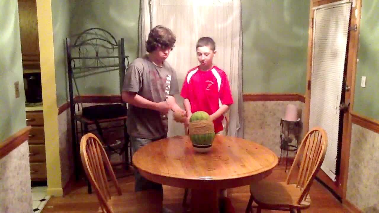 Two boys wrap rubber bands around a watermelon on a table at home until it suddenly explodes, breaking a light fixture above it at 3:40