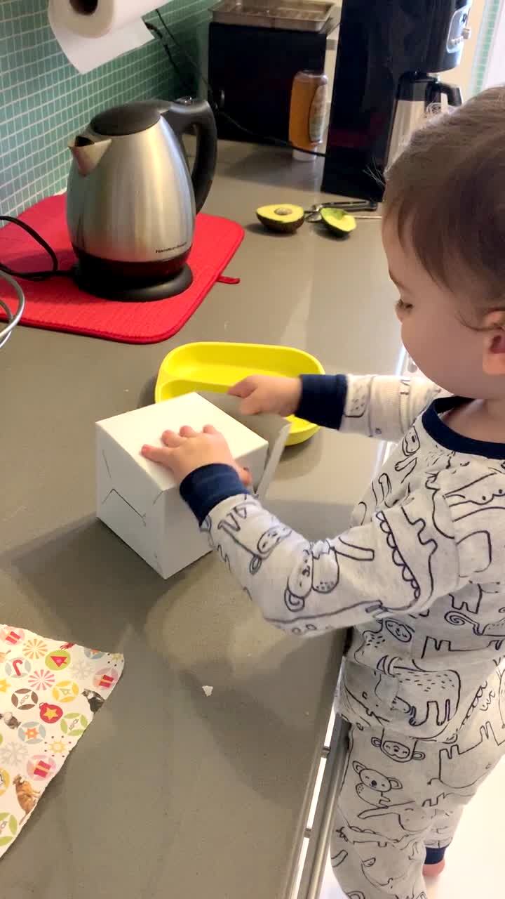 A tot boy opens a Christmas present and gets a glass Christmas ornament but he throws it on the floor in a kitchen and it shatters.