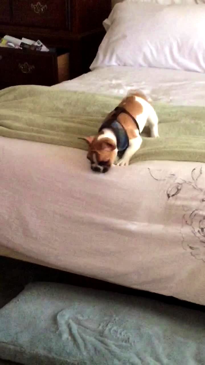 A girl runs and does a somersault onto a bed in a bedroom indoors. Her dad does one next and he falls off the end of the bed and hits a wall and knocks a picture off the wall.