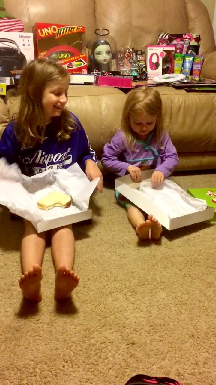 A tot girl measures out oatmeal into a large measuring cup and each time her mom and brother tell her she needs to measure another cup, she runs to a cabinet to grab a drinking cup.