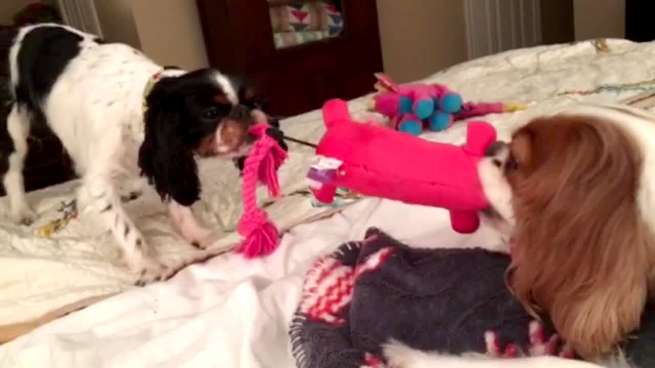 A man brings his wife balloons and breakfast in bed in her bedroom indoors and one of the balloons gets caught in the ceiling fan.