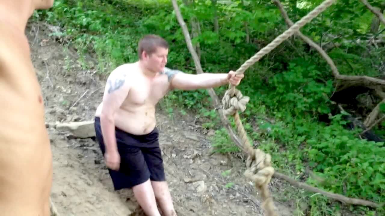 A man jumps on a trampoline with his tot kids outdoors and falls through the bottom when the floor tears after he does a flip.