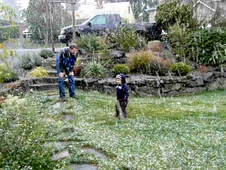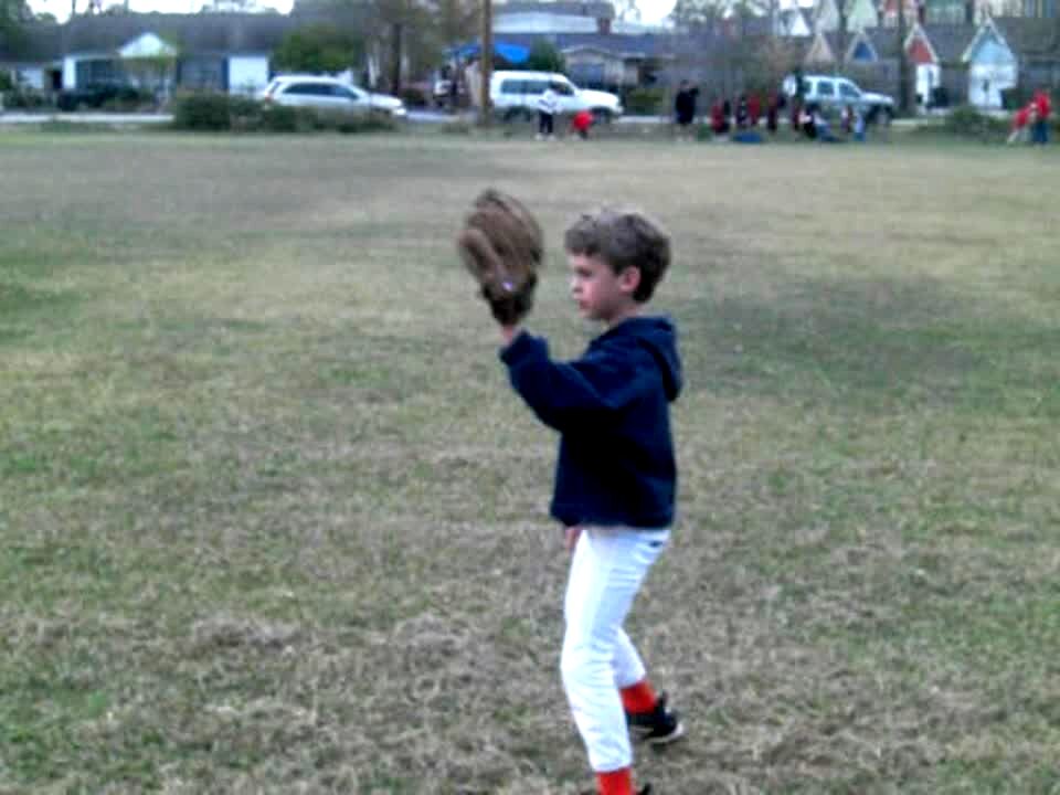 A young girl hits a wiffleball that hits her father in the head while he sits in a lawn chair in the yard. It ricochets off his head and flies offscreen.