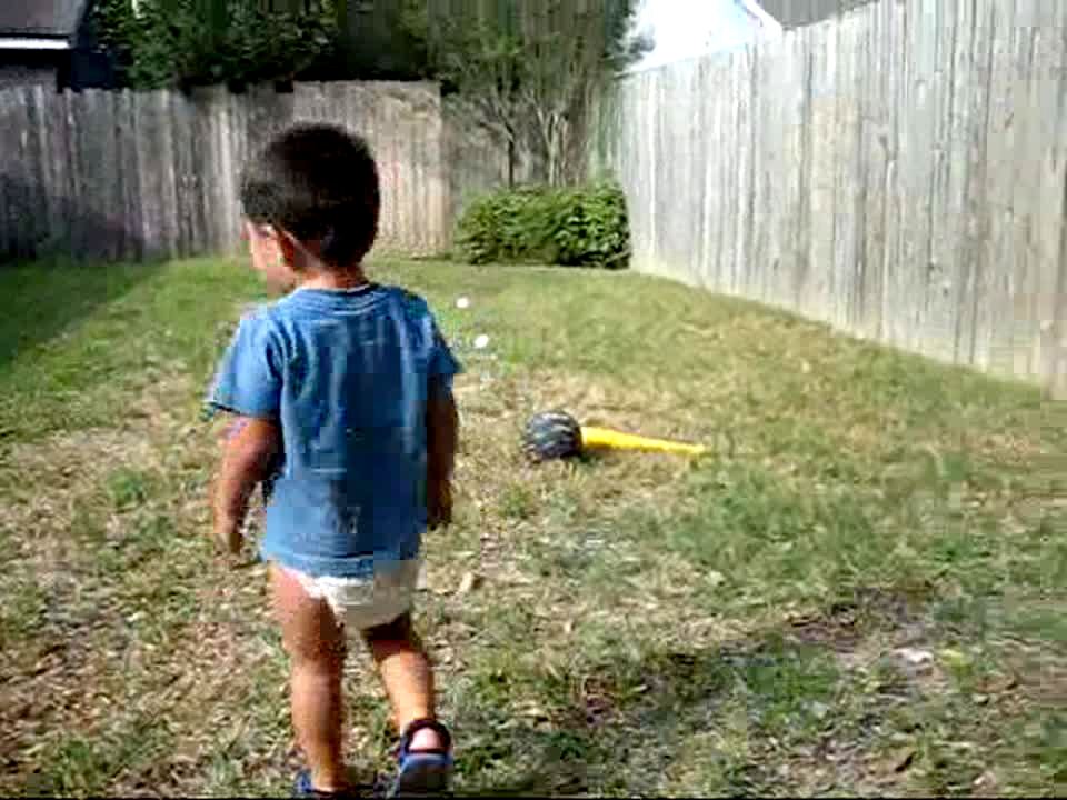 Tot boy hits baseballs from automatic pitching machine. He misses, gets mad & runs towards the camera, then gets hit by a pitched ball to the face. He falls & cries.