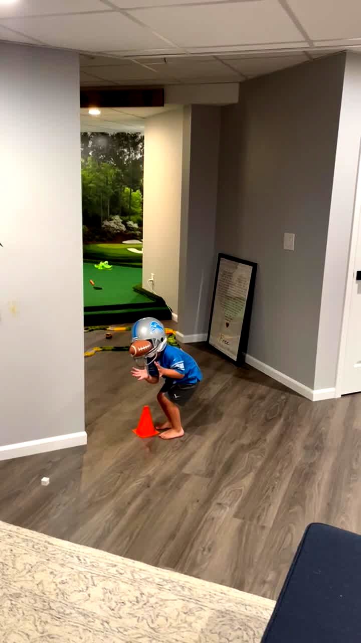 Tot boy hits a toy golf ball into dad's groin in the living room. Crotch hit.
