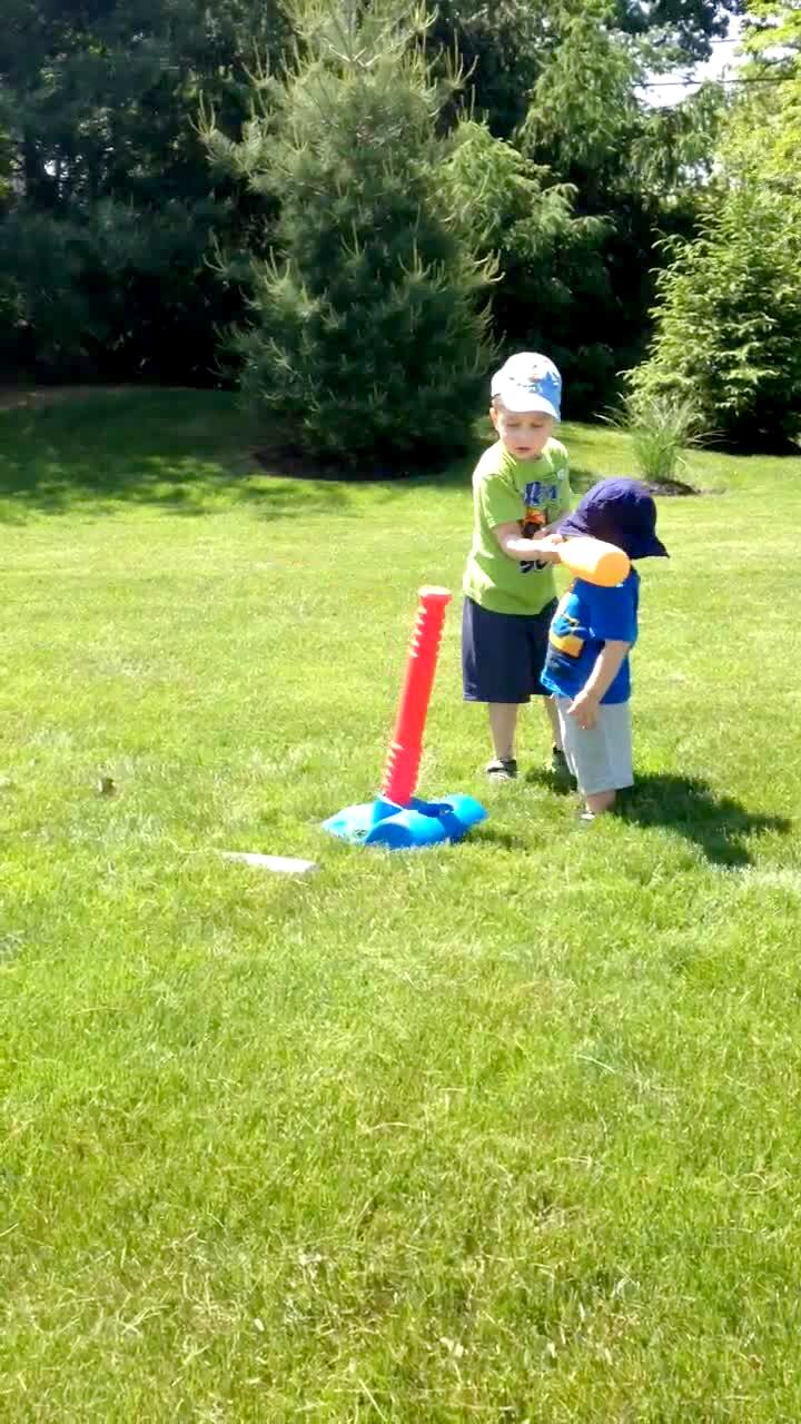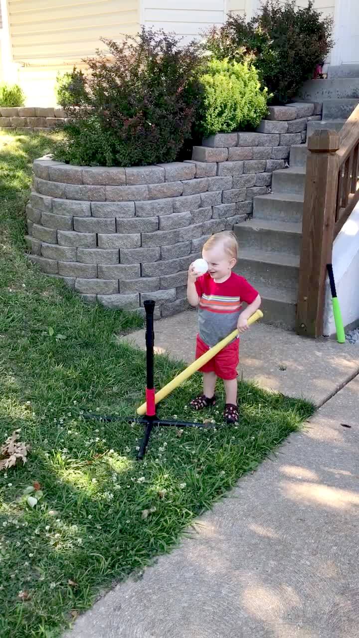 A tot boy in a yard hits a ball off a tee with a baseball bat and it hits a man in the groin and the tot boy laughs. Security camera.