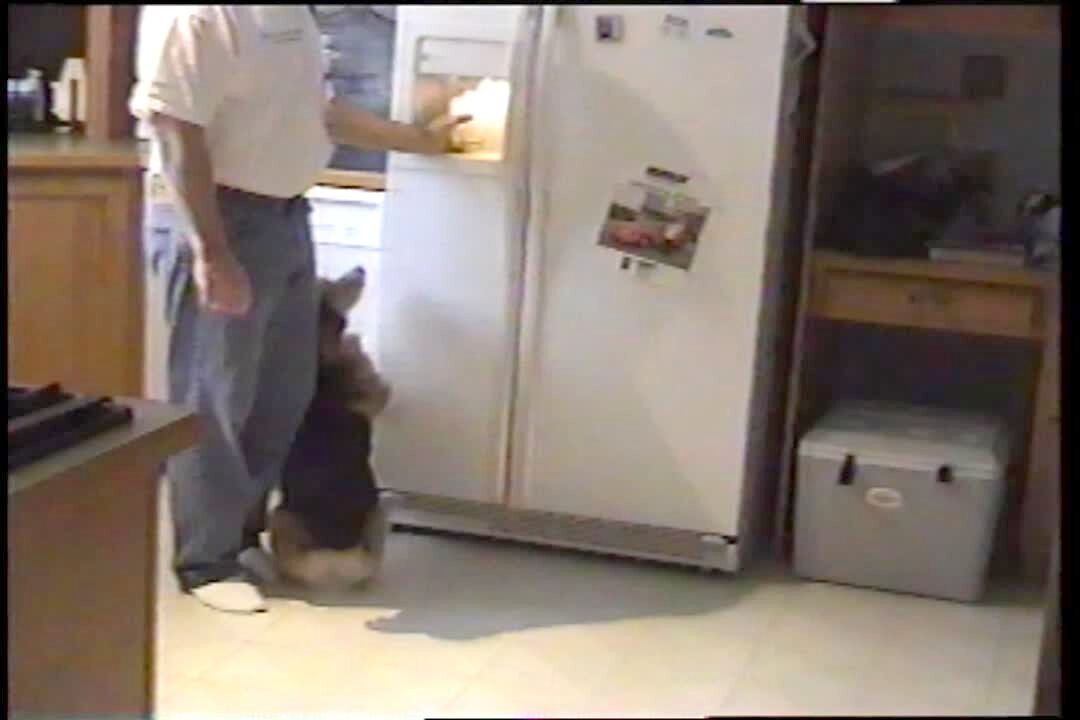 A dog puts its paw up when a man asks "who wants ice cream" in the kitchen.