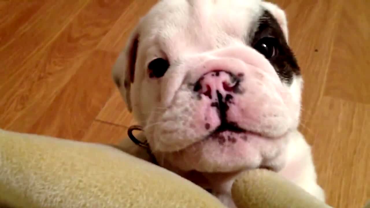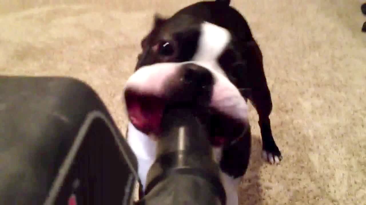A boston terrier puppy makes funny faces as he tries to bite at the hot air coming out of the back of a vacuum cleaner indoors.