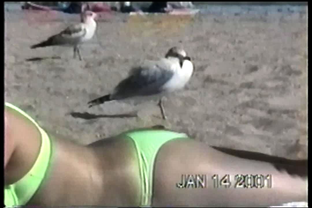 A man eats a cheesesteak on the beach when a seagull steals it out of his hand. Music rights not cleared.