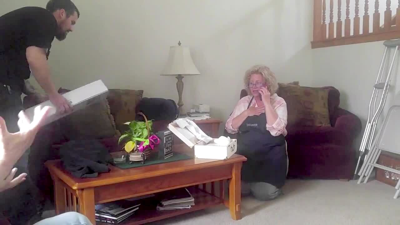 Blue powder from a gender reveal cannon covers a senior woman in the backyard when it explodes as she twists it.