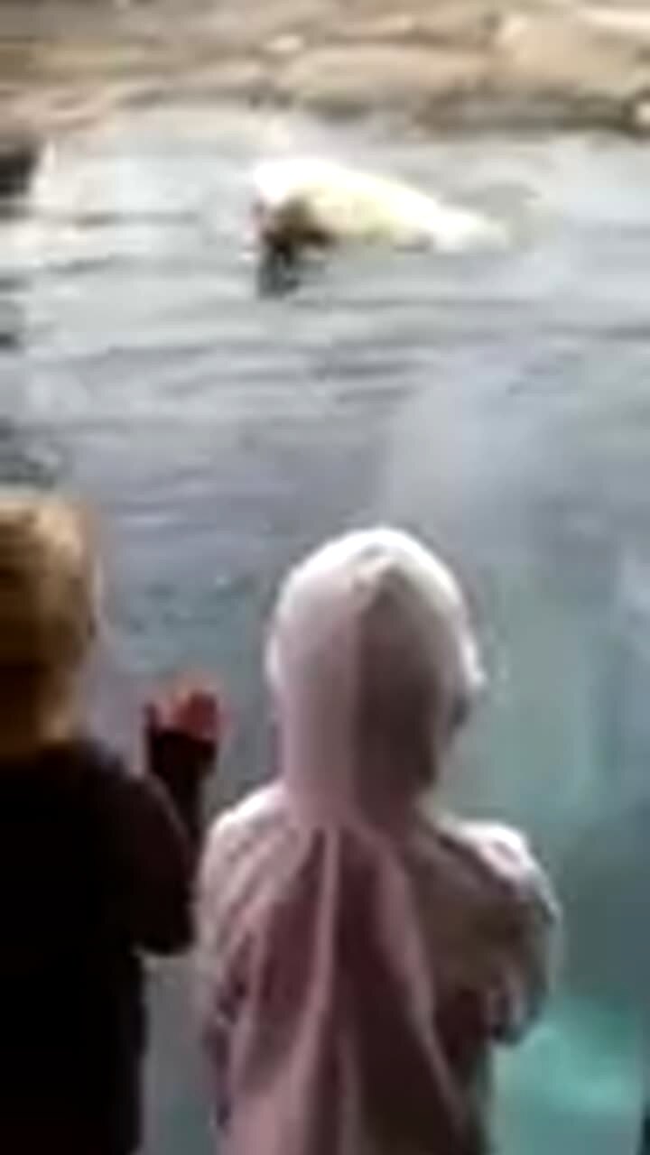 A polar bear at a zoo jumps at a window and scares a couple of kids who are watching. Adults yell off camera.