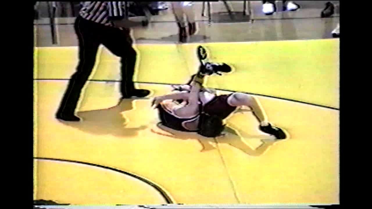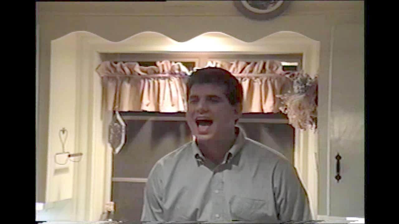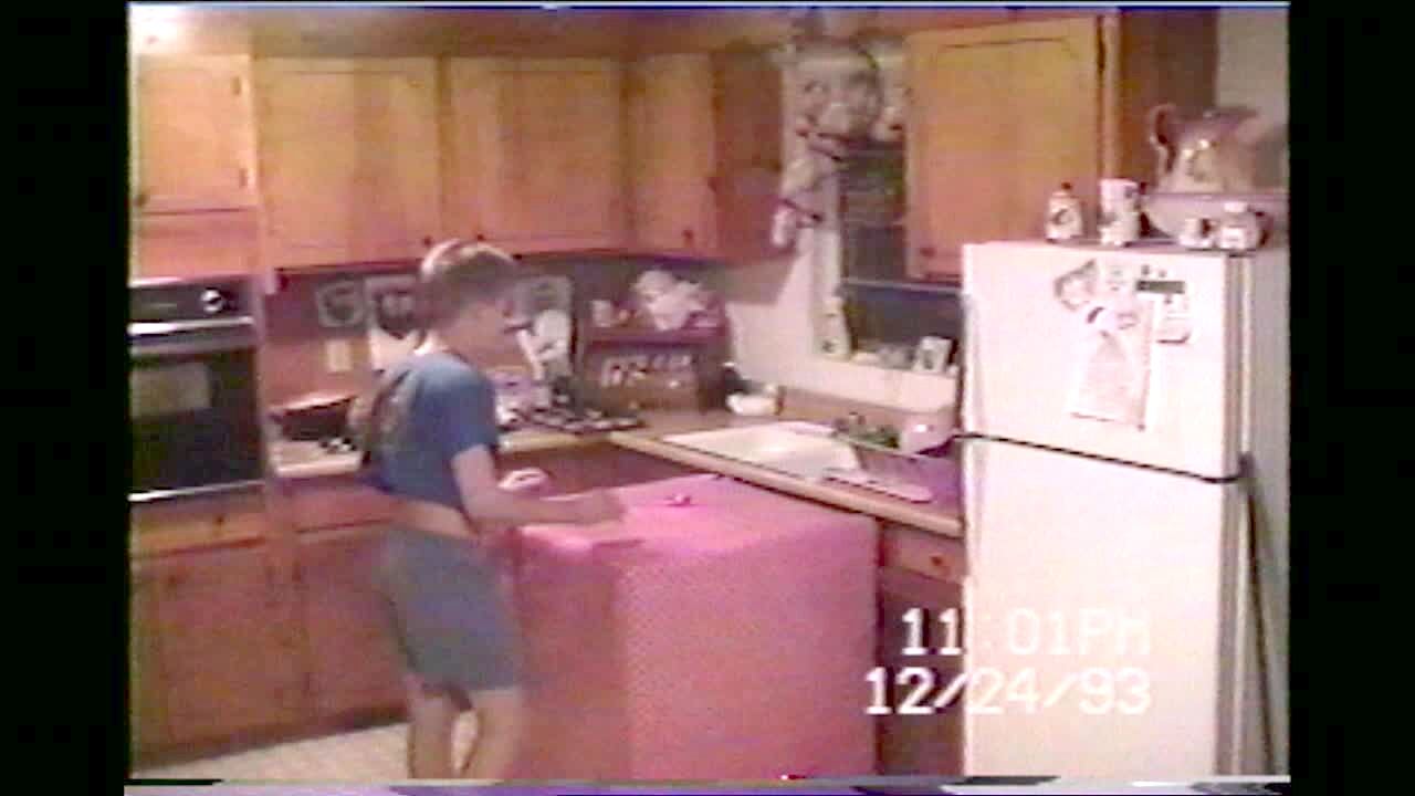 Surprise Christmas gift. Teen opens big box, surprised by cousin inside. He punches and wrestles with him on kitchen floor.