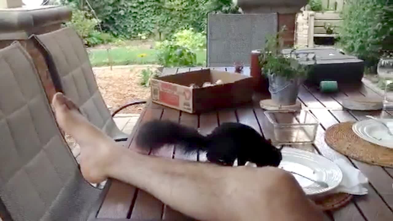 A squirrel climbs on a man outdoors on a patio and then jumps on the woman filming it and she reacts. 00:38