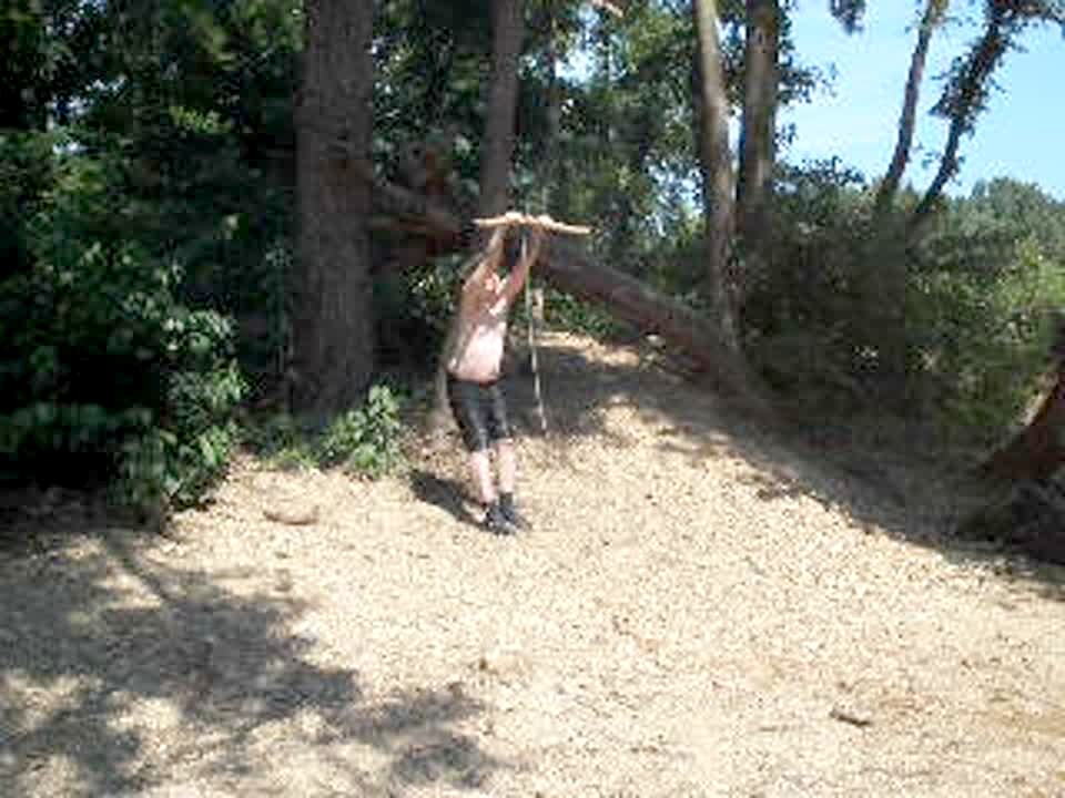 Man tries to fix a rope swing and swing out over a river, it breaks and he falls on his face on the shore.