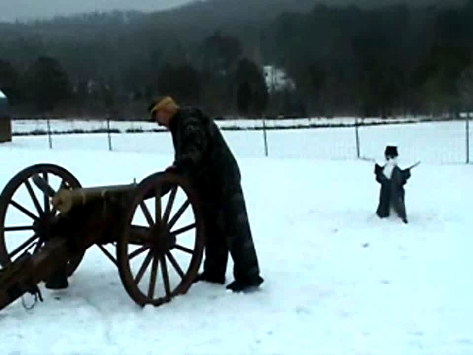 Senior man in a Confederate Civil War uniform dresses a snowman on a snow covered field in a Northern Civil War soldier uniform. He sets it up in front of a Civil war cannon, calls it a "Yankee Snowman," fires the cannon, and blows the snowman up.