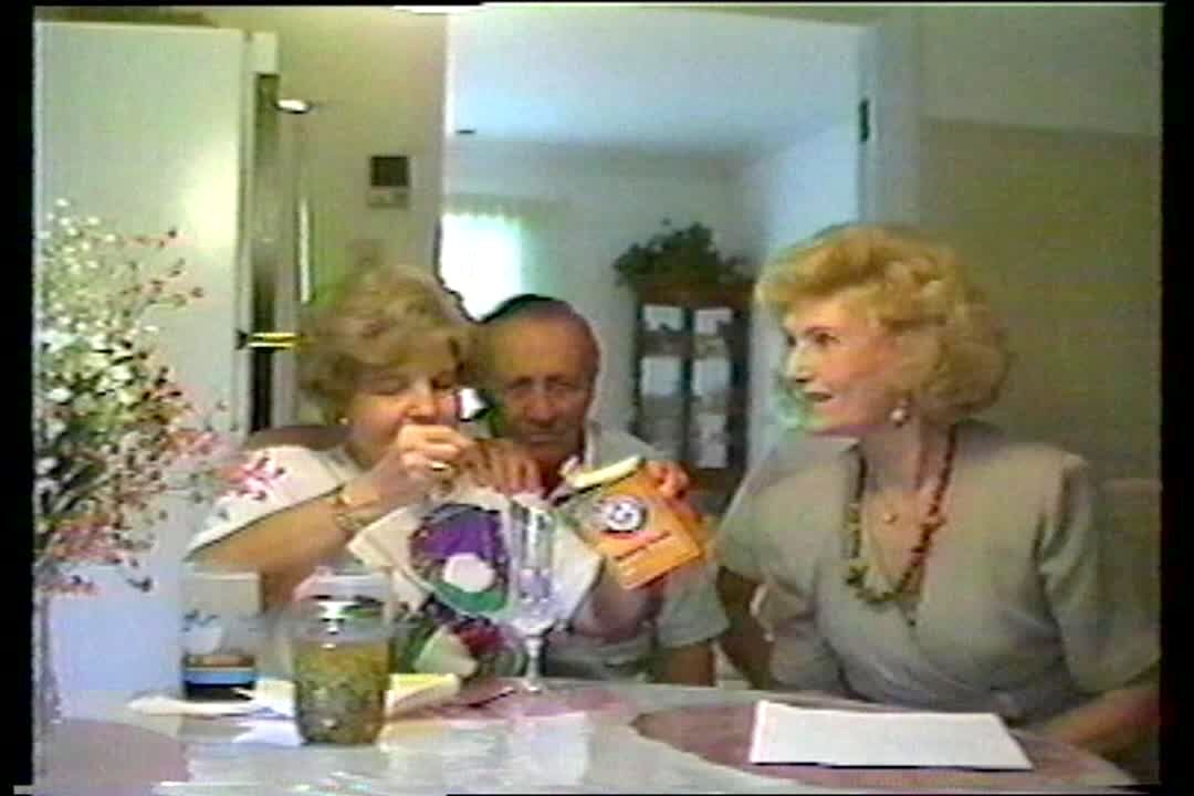 A woman opens a bottle of champagne with a saber and the cork flies off camera and hits another woman in the forehead. The second woman's face begins to bleed.