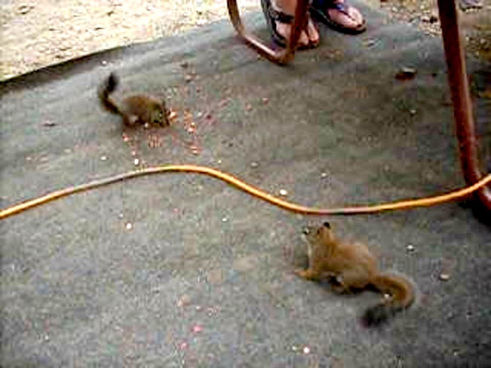 2 squirrels play fight and wrestle over nuts outside on a mat.