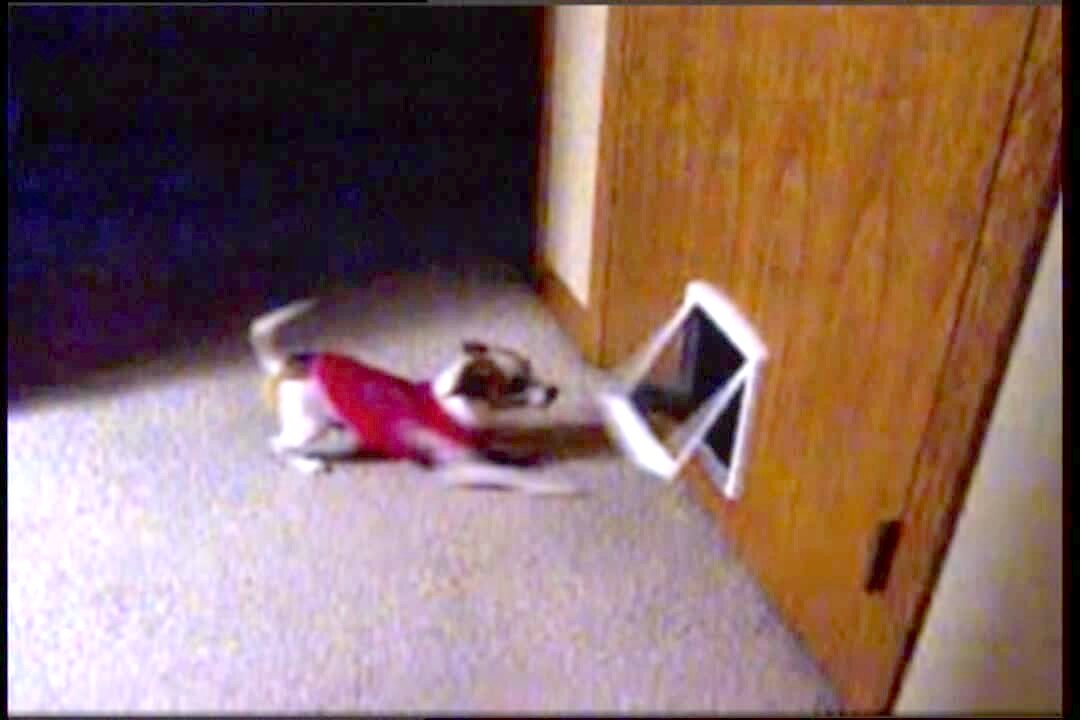 Angry little dog bites and chews on windows as it rolls up and down. Date on screen