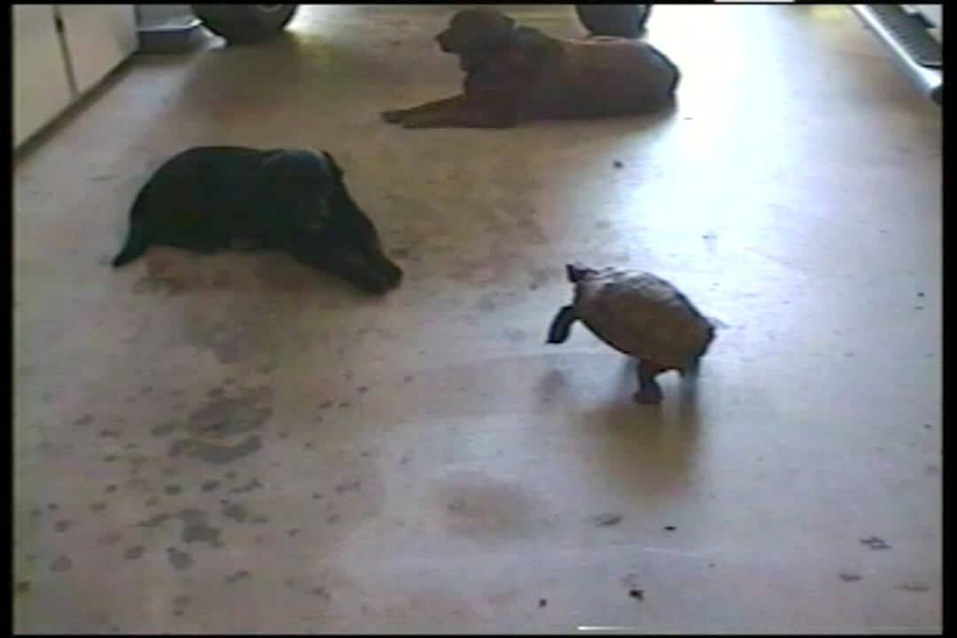 Woman in a fat suit and bikini gets chased around the yard by dogs.
